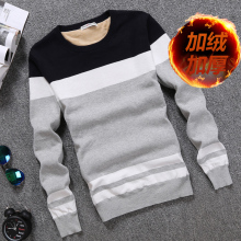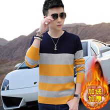 冬季男士毛衣圆领韩版毛线衣保暖上衣加绒加厚条纹针织羊毛打底衫