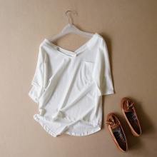 外贸原单女装夏季新款欧美气质蝙蝠袖纯色后V领口袋棉质t恤