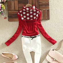 2015冬装新款韩版高领打底衫长袖修身蕾丝衫通勤镶钻女t恤上衣潮