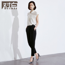 【杜鹃同款】 对白 2017夏装新款斜门襟休闲九分裤 修身小脚裤