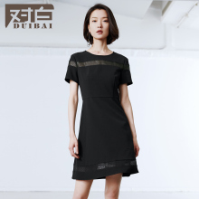 【杜鹃同款】对白 2017夏装新款短袖连衣裙 拼接网纱雪纺小黑裙 M