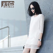 【杜鹃同款】对白七分袖气质连衣裙女2017夏装新款直筒条纹裙子