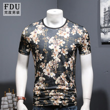夏装新品丝光棉潮流短袖t恤男 个性大满花印花半袖修身男士体恤潮