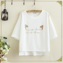 森女系卡通猫咪字母印花宽松百搭短袖T恤学生萌日系上衣 夏季女装