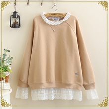 日系森女系甜美清新拼接蕾丝划款加绒宽松卫衣女套头上衣春装新款