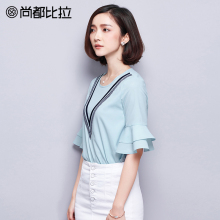 尚都比拉2017夏季新款宽松荷叶边雪纺衫女韩版百搭小衫喇叭袖上衣