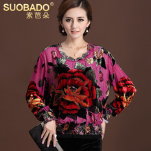 索芭朵2017春中年妈妈装长袖宽松花色桑蚕丝T恤 真丝丝绒上衣