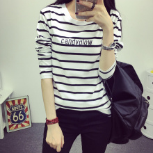 蜜女格格秋季新款韩版宽松大码条纹字母长袖T恤上衣学生打底衫女