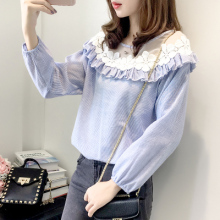 2017春款新款韩版圆领网纱蕾丝拼接宽松上衣九分袖条纹衬衫女