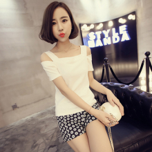 2016春装新款韩版别致时尚双肩带露肩纯色宽松套头短袖T恤上衣女