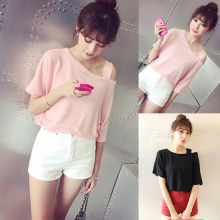 夏天衣服女学生上衣韩版女服蘑菇街潮夏装女装斜肩露肩短袖T恤女