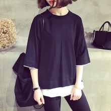 2017春夏装韩版宽松纯色假两件衬衫拼接短袖T恤女休闲上衣学生潮