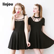 linjou玲玖复古学院风性感漏背显瘦短袖a字连衣裙夏赫本小黑裙