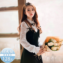yoyo原创蝴蝶结蕾丝长袖衬衫黑色吊带连衣裙两件套修身春秋套装裙