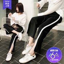 chic韩风侧条纹雪纺开叉阔腿裤女裤子九分开衩休闲校服运动裤薄款