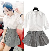 2017春夏新款女装衬衫上衣小香风时尚百搭衬衣+条纹套装两件套装