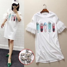 2017夏季新款重工五只镶钻鞋子图案网沙拼接圆领喇叭袖连衣裙女