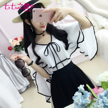 七七之缘2017夏季新款女装 白色荷叶领袖黑边防晒修身T恤雪纺衫