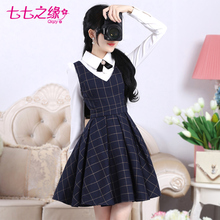七七之缘春装新款女装韩版 深蓝格子百搭欧根纱高腰背带裙