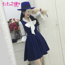 七七之缘春装新款女装韩版 深蓝色蕾丝蝴蝶结修身背心连衣裙