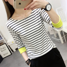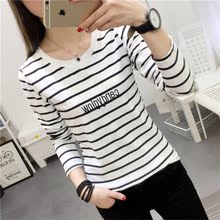 买一送一 春季女装打底衫外穿上衣体恤横条纹长袖t恤女刺绣学生装