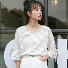 V领喇叭袖系带小清新衬衫 夏装韩国荷叶袖小格子学生中袖衬衣上衣