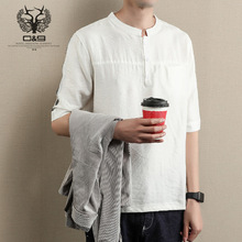 日系宽松亚麻男士短袖t恤韩版修身圆领潮流七分袖五分半袖体恤男
