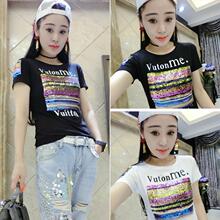 夏季新款女装短袖t恤衫修身显瘦纯棉体恤卡通亮片打底衫女士上衣