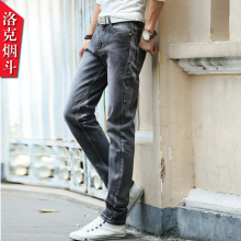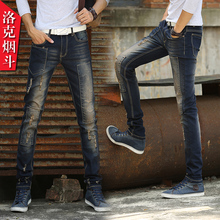 洛克烟斗秋天韩版修身款小脚裤拼接补丁破洞复古水洗学生牛仔裤男