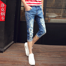 春夏季薄款男士牛仔短裤 韩版修身破洞潮7分裤青少年弹力七分裤子