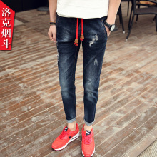 牛仔裤男小脚青少年夏学生松紧腰弹力修身破洞系带日系九分裤潮薄