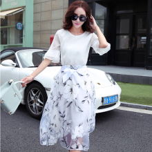 初秋新款白色雪纺印花长裙套装修身短袖连衣裙女韩版印花裙两件套