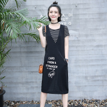 圆领中腰套头A字裙2017年夏季短袖中长款口袋拼接印花背带两件套