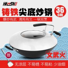 豪森尖底铸铁锅炒锅不粘锅无烟无涂层健康手工铁锅双耳生铁大炒锅