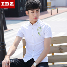 夏季男士白衬衫男短袖修身青年韩版潮流百搭帅气薄款刺绣花衬衣寸