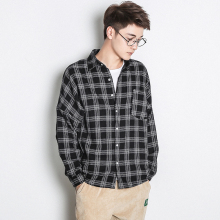 春季日系复古格子印花长袖衬衫男士大码宽松衬衣韩版上衣潮流男装