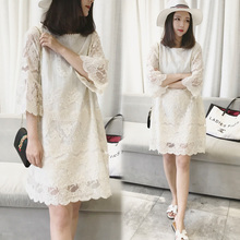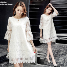 中长款连衣裙2017春夏新款淑女中袖宽松a字欧根纱圆领白色蕾丝裙