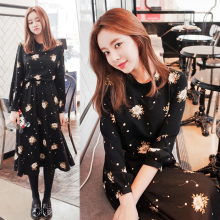 连衣裙女2017春夏新款韩版印花雪纺裙大码圆领收腰气质印花长裙女