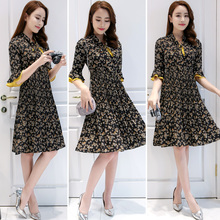 连衣裙女春2017新款韩版雪纺收腰显瘦喇叭7分袖百褶中长款碎花裙