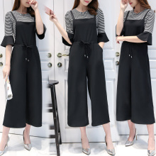 夏装新款女韩版大码简约条纹T恤上衣时尚套装休闲背带阔腿裤2件套
