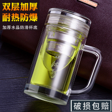 古琦水晶玻璃杯双层带盖带把 手柄过滤茶杯水杯男士办公泡茶杯子
