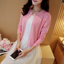 2017春秋新款高腰短款简约修身针织外搭长袖圆领针织衫女开衫外套