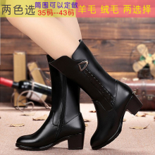 秋冬新款真皮女鞋子大码中跟单靴粗跟马丁靴中筒靴子厚底妈妈棉靴