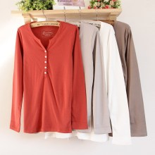 包邮春装新款小衫女装韩版欧洲纯棉纽扣V领长袖T恤打底衫大码11