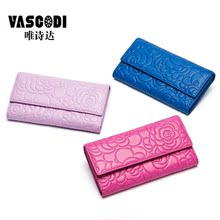 VASCODI唯诗达羊皮花朵长款三折钱包真皮女士手拿搭扣零钱包女