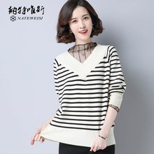 春装新款女装长袖条纹针织衫女韩版时尚套头蕾丝V领宽松大码上衣