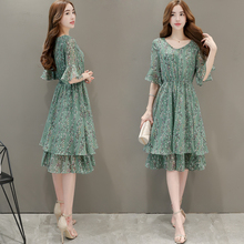 正品雪纺连衣裙女夏2017新款韩版显瘦收腰中裙V领高腰气质碎花裙
