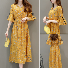 2017夏季新款韩版女装气质显瘦印花大摆长裙喇叭袖碎花雪纺连衣裙