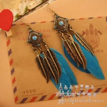 包邮日韩国耳饰品复古夸张蓝色长款孔雀羽毛原创耳坠气质大耳环女