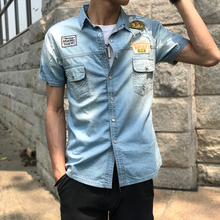 青少年休闲印花纯棉牛仔短袖衬衫男复古学生帅气修身韩版潮衬衣服